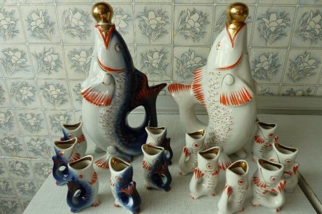 Сервіз «Рибка» складався з графина об’ємом 700 мл і 6-ти чарок по 30 мл. Набір для алкоголю у формі рибок вигадав грузинський художник Барамідзе Абесалом Давидович. Відомо, що перший набір був виготовлений у білому й золотому кольорах. 1956-1959 років цей сервіз був представлений на різноманітних закордонних виставках кераміки та отримав визнання і популярність.